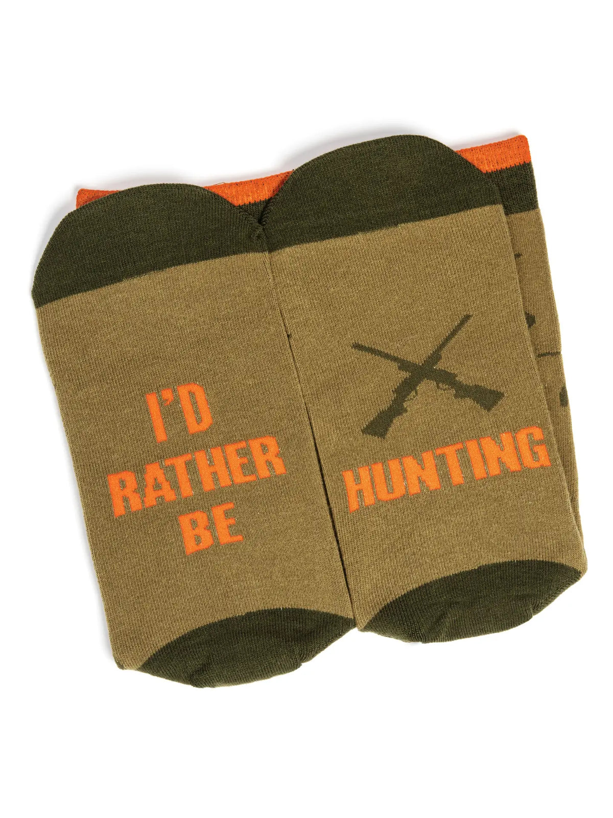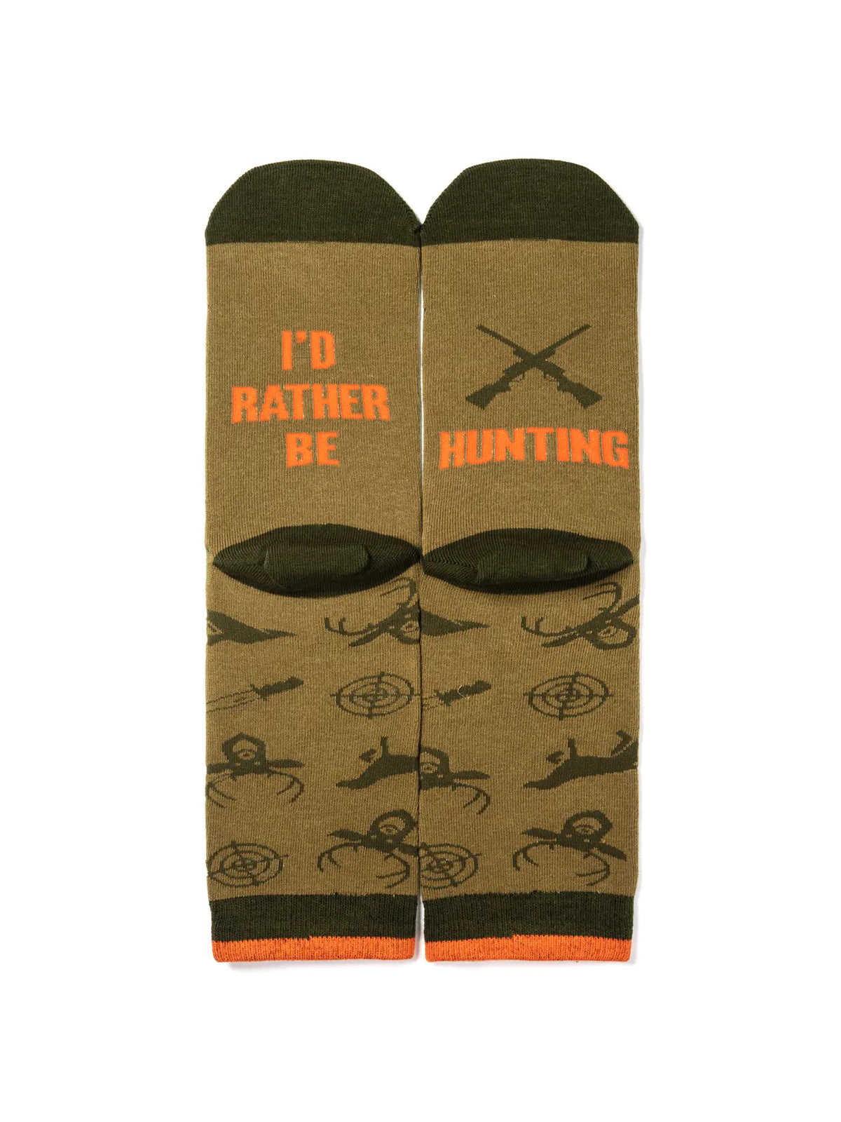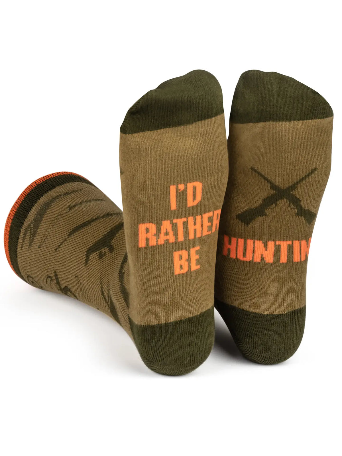 You'd rather be hunting! You don’t have to tell your boss, let your socks do the talking! Camouflage green colors keep you concealed in the office, while the bottom sports a fun message: “I’d Rather Be Hunting.” The socks feature a stylish and sharp pattern with deer, ducks, dogs, crosshairs, rifles and hunting knives. The cuff is accented with blaze orange to really fire off the camo color theme. A fantastic present for hunters, husbands, dads, grandfathers, a gag gift for your boss, or a Christmas stocking stuffer for the outdoorsman or woman in your life!