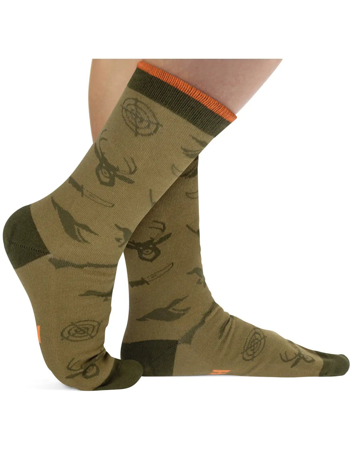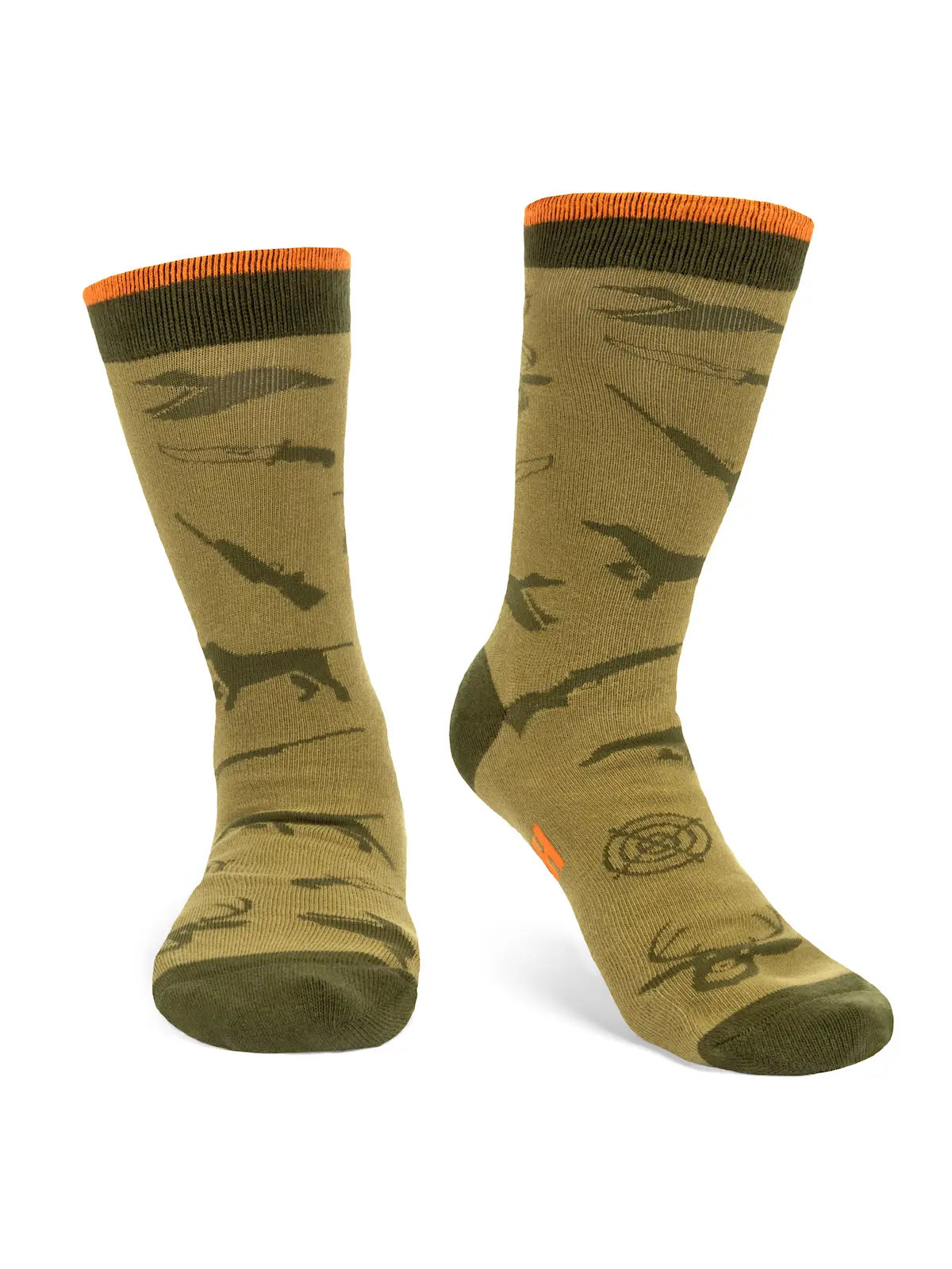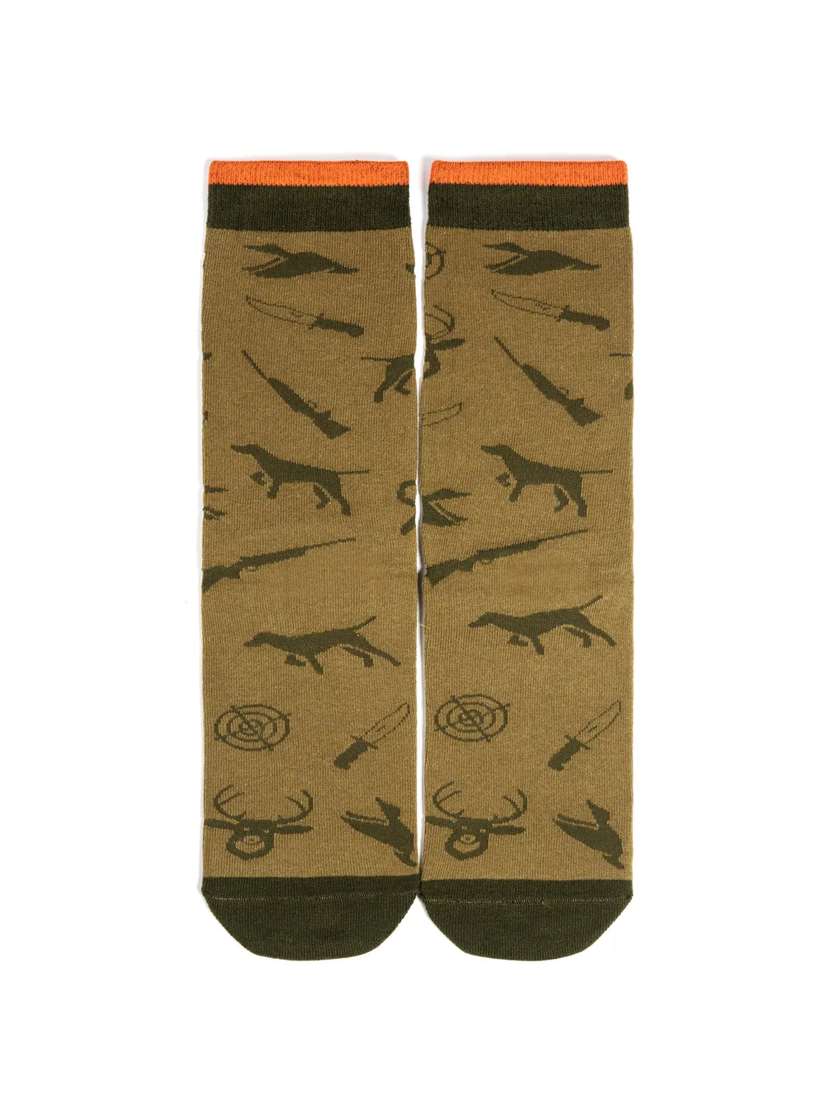 You'd rather be hunting! You don’t have to tell your boss, let your socks do the talking! Camouflage green colors keep you concealed in the office, while the bottom sports a fun message: “I’d Rather Be Hunting.” The socks feature a stylish and sharp pattern with deer, ducks, dogs, crosshairs, rifles and hunting knives. The cuff is accented with blaze orange to really fire off the camo color theme. A fantastic present for hunters, husbands, dads, grandfathers, a gag gift for your boss, or a Christmas stocking stuffer for the outdoorsman or woman in your life!