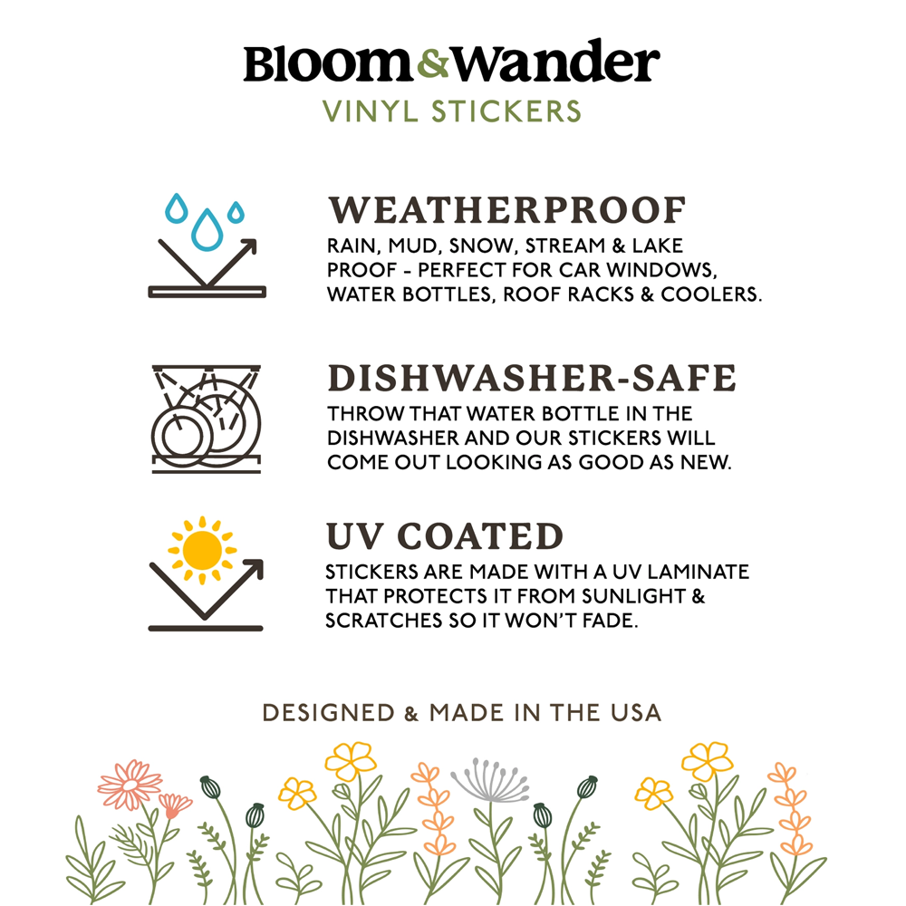 - Heavyweight vinyl - Waterproof - Weatherproof! - Dishwasher safe! - Safe to place on vehicles, water bottles, laptops, and more!